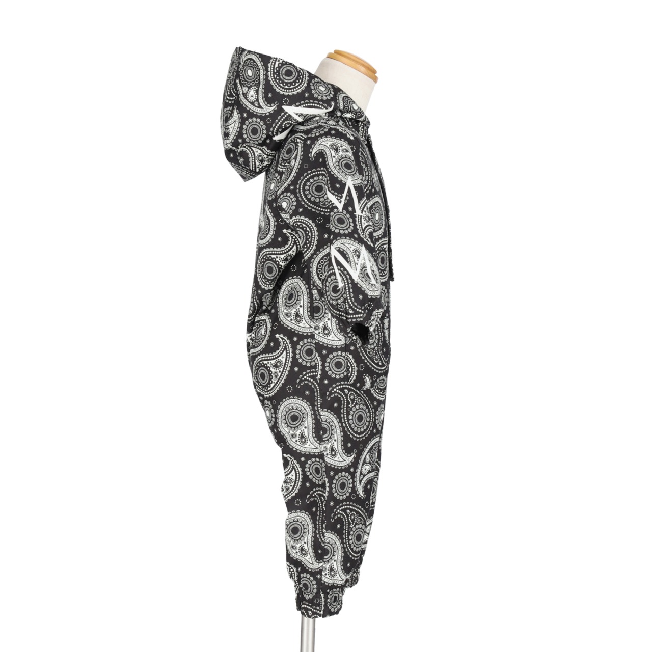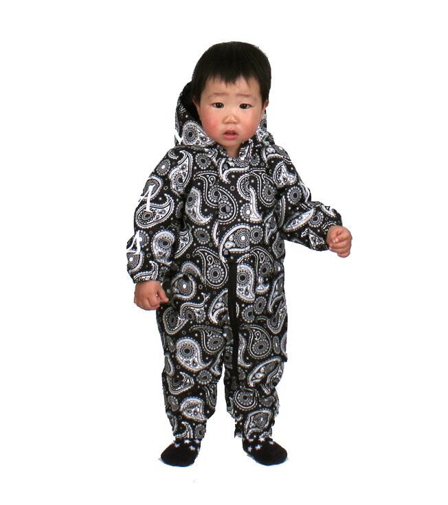 ML5006 BABY ONE PIECE 995 BLACK PAISLEY 80cmです。新生児用に開発された、中綿入りワンピースです。新生児用の高耐水圧の服が見当たらず、創りました。寒い季節におすすめです。まだしゃべることができず、自分の意思を伝えられない子を寒さから守る、画期的なアイテムです。スキー場はもちろんですが、街着としても威力を発揮します。身頃と同じ柄がプリントされたファスナーは、見た目にも自然な一体感を演出します。弊社のこだわりの一つです。最近インスタ映えすると、大人気の商品です。耐水圧は30,000mm、透湿8,000g/m2-24hです。定価22,000円です。※送料無料(日本国内のみ)サービス中です。