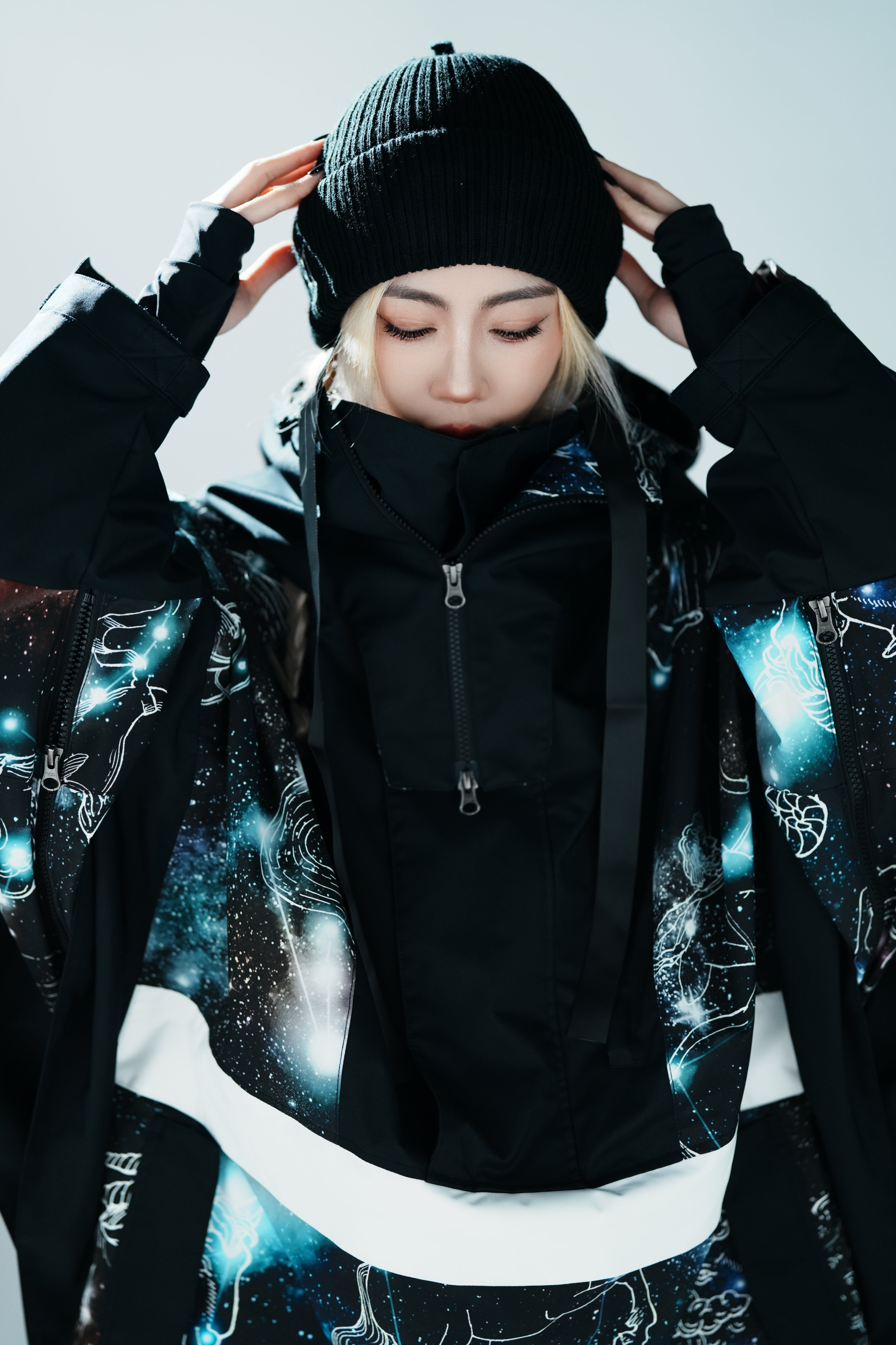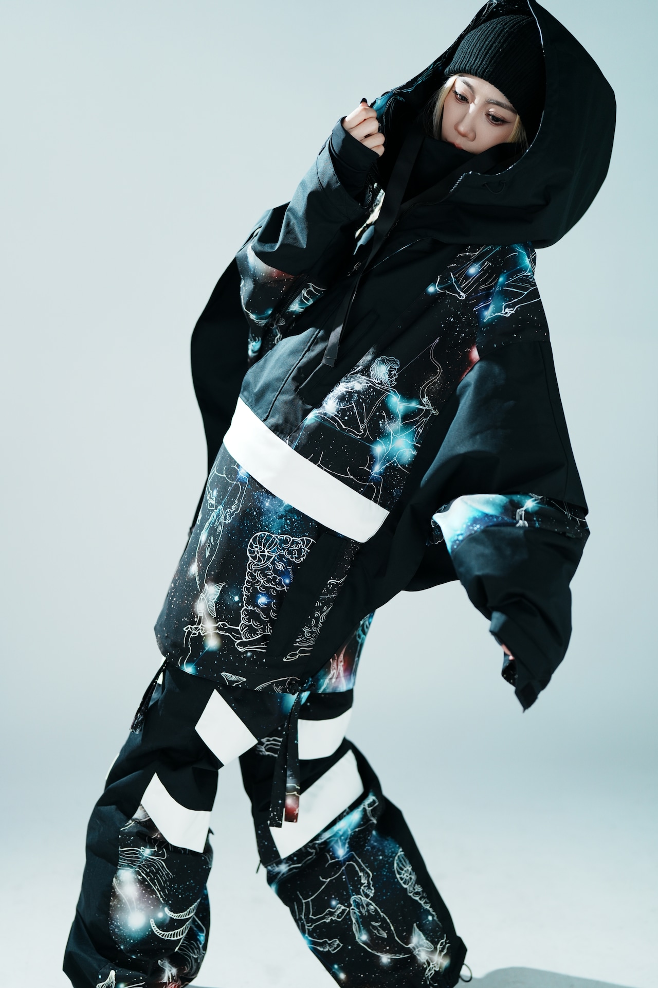 ■首前を覆う、新型脱着フードは、様々な着こなしを演出します。
